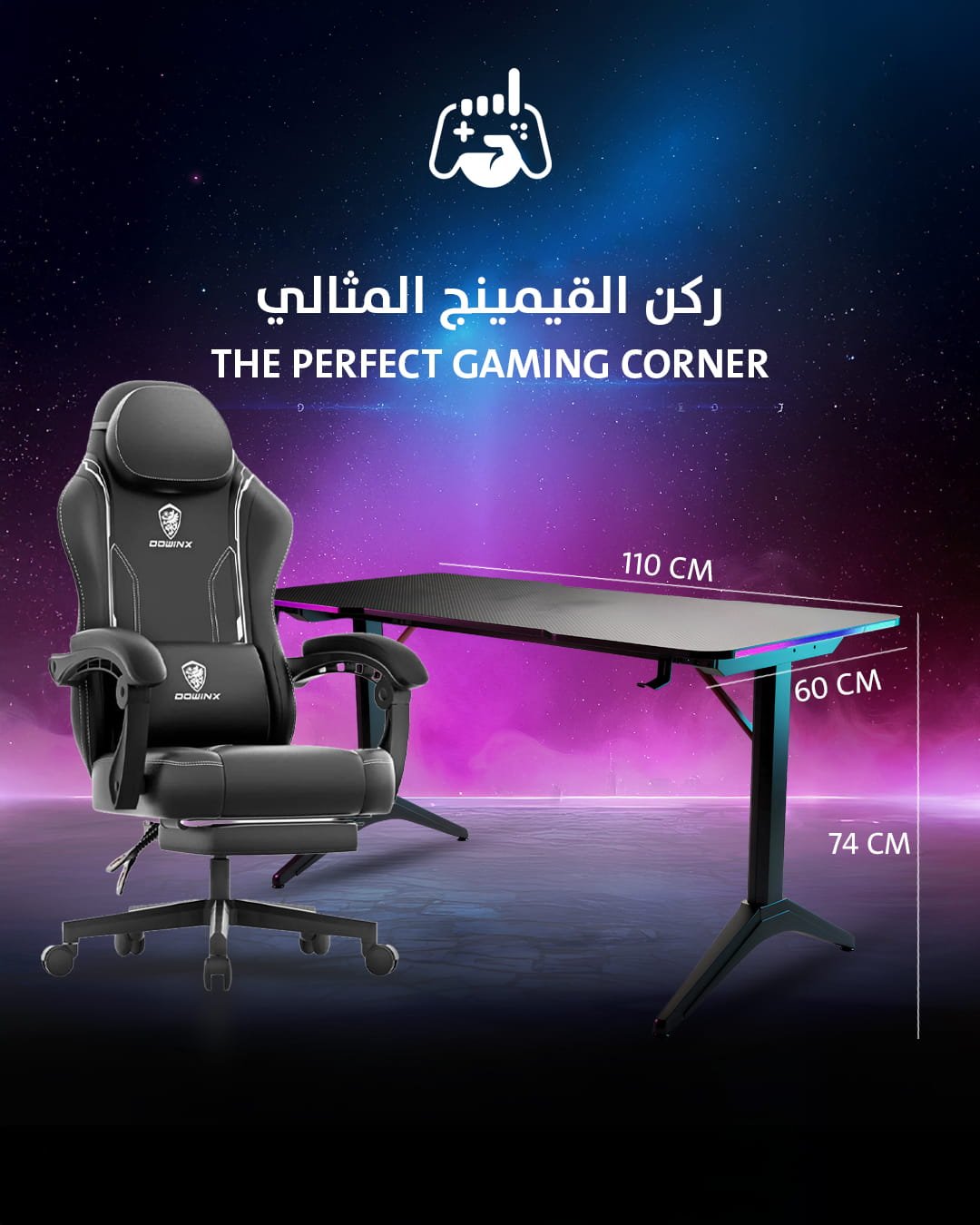 باكدج كرسي وطاولة الألعاب يمنحك ركن جيمينج متكامل: كرسي مريح مع مسند قدم للاسترخاء، وطاولة بمقاس عملي وإضاءة ولمسات تنظيم ذكية. خيار مثالي لو عايز إعداد جاهز سريع، شكله حلو ومناسب للاستخدام اليومي.